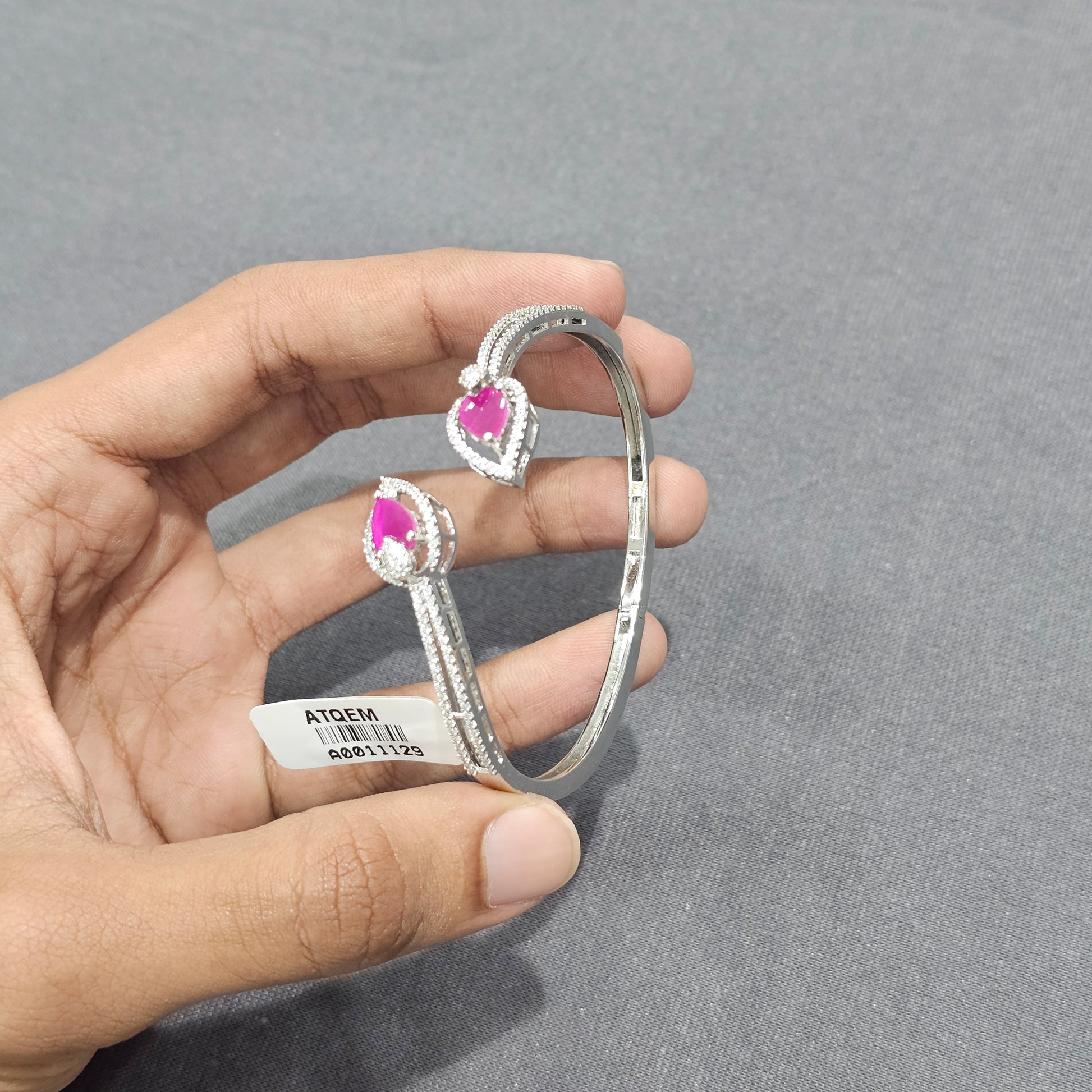 A chic open cuff with twin pear-cut ruby-pink centers framed by pavé halos and streamlined triple CZ rows. Lightweight, stack-friendly, and perfect for occasion wear or daily sparkle.
