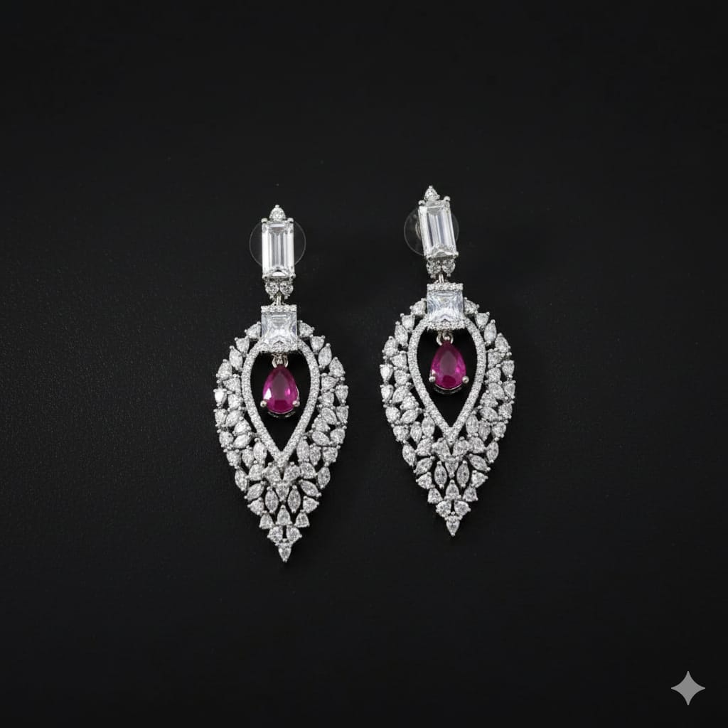 Stunning ruby teardrop halo earrings with sparkling CZ diamonds. Perfect luxury statement jewelry for evening events and special occasions.