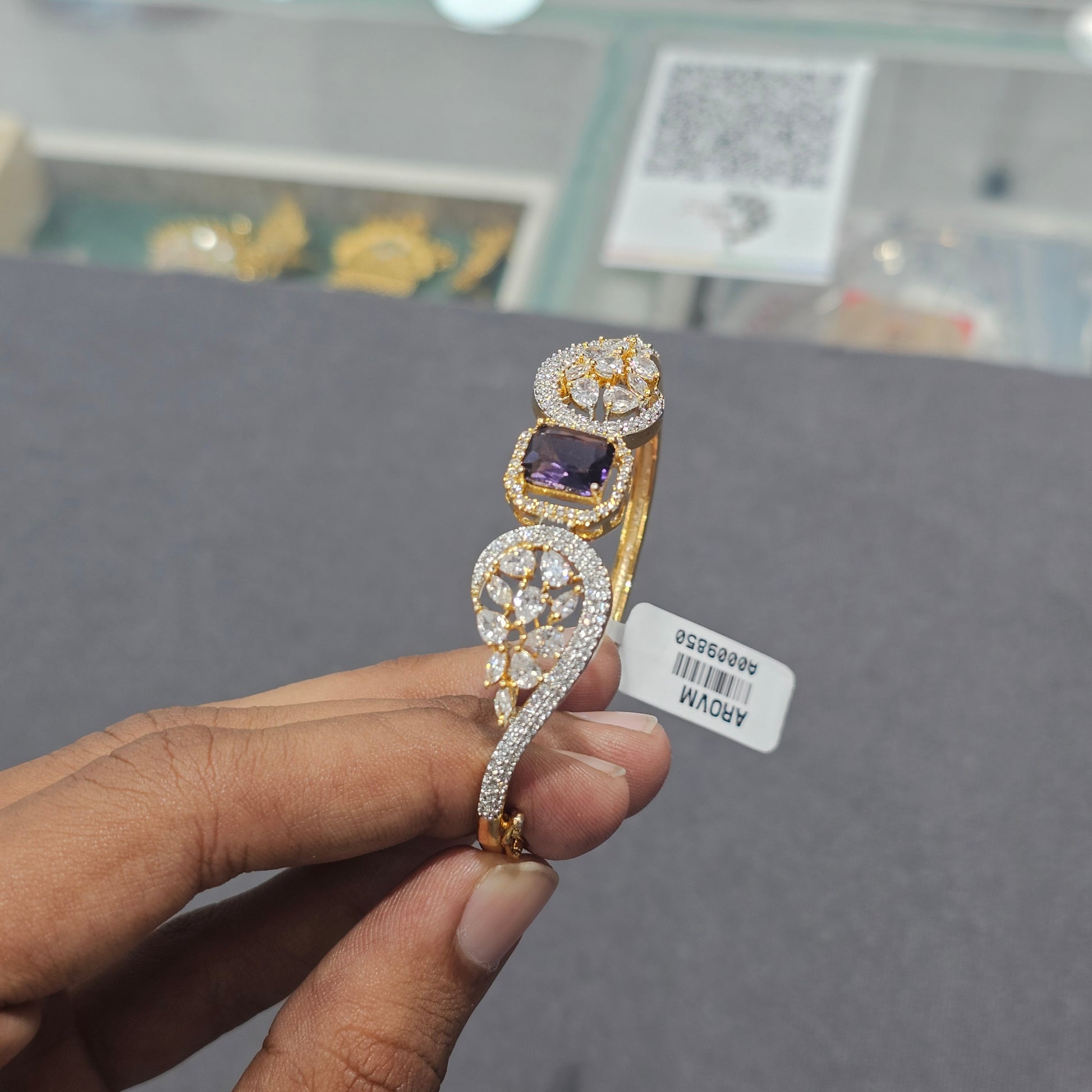 A graceful gold-tone cuff featuring a cushion-cut amethyst center flanked by vine-inspired marquise CZ motifs within pavé teardrop frames. Lightweight, elegant, and perfect for festive looks or special evenings.