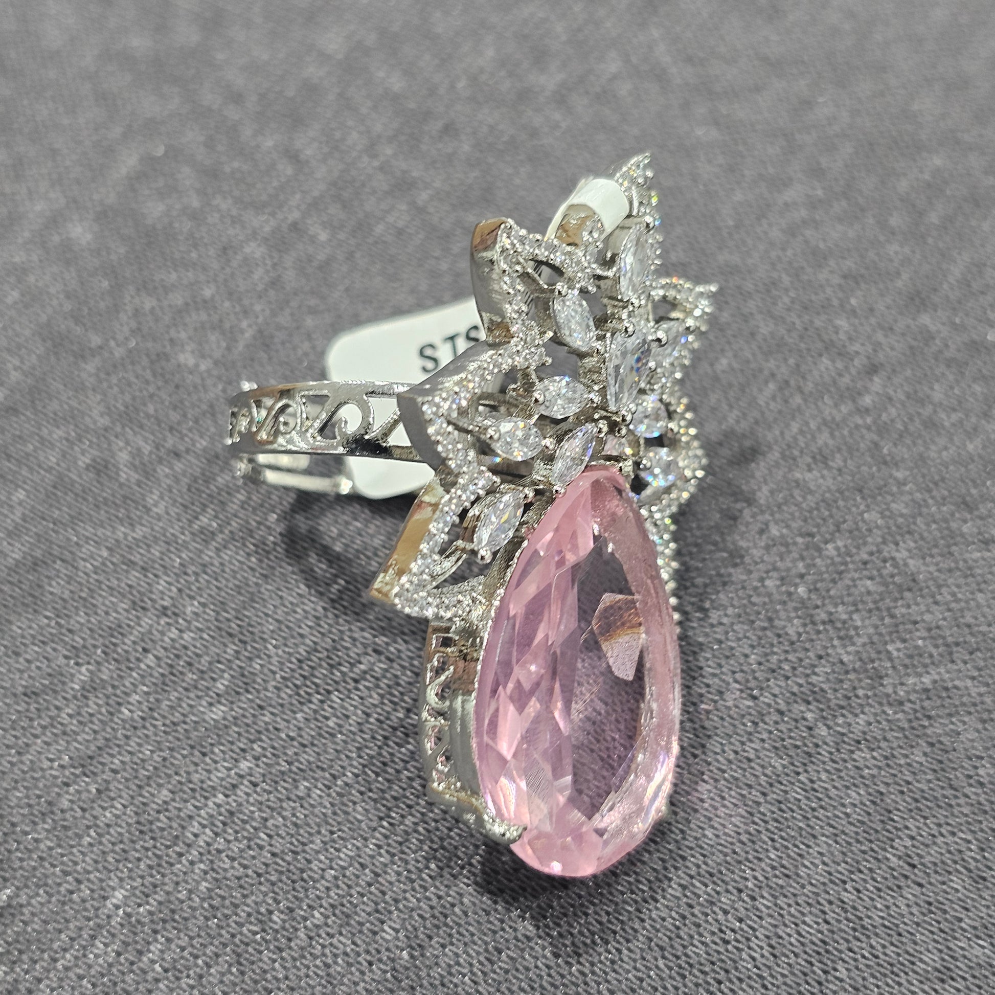 This dramatic oversized cocktail ring features a large, rich deep pink/ruby pear-cut stone mounted below a sparkling, open-work six-petal star or flower cluster of white cubic zirconia. The modern, elegant design makes it a truly exceptional and eye-catching accessory.