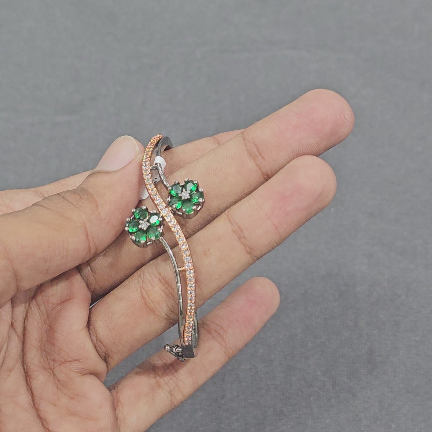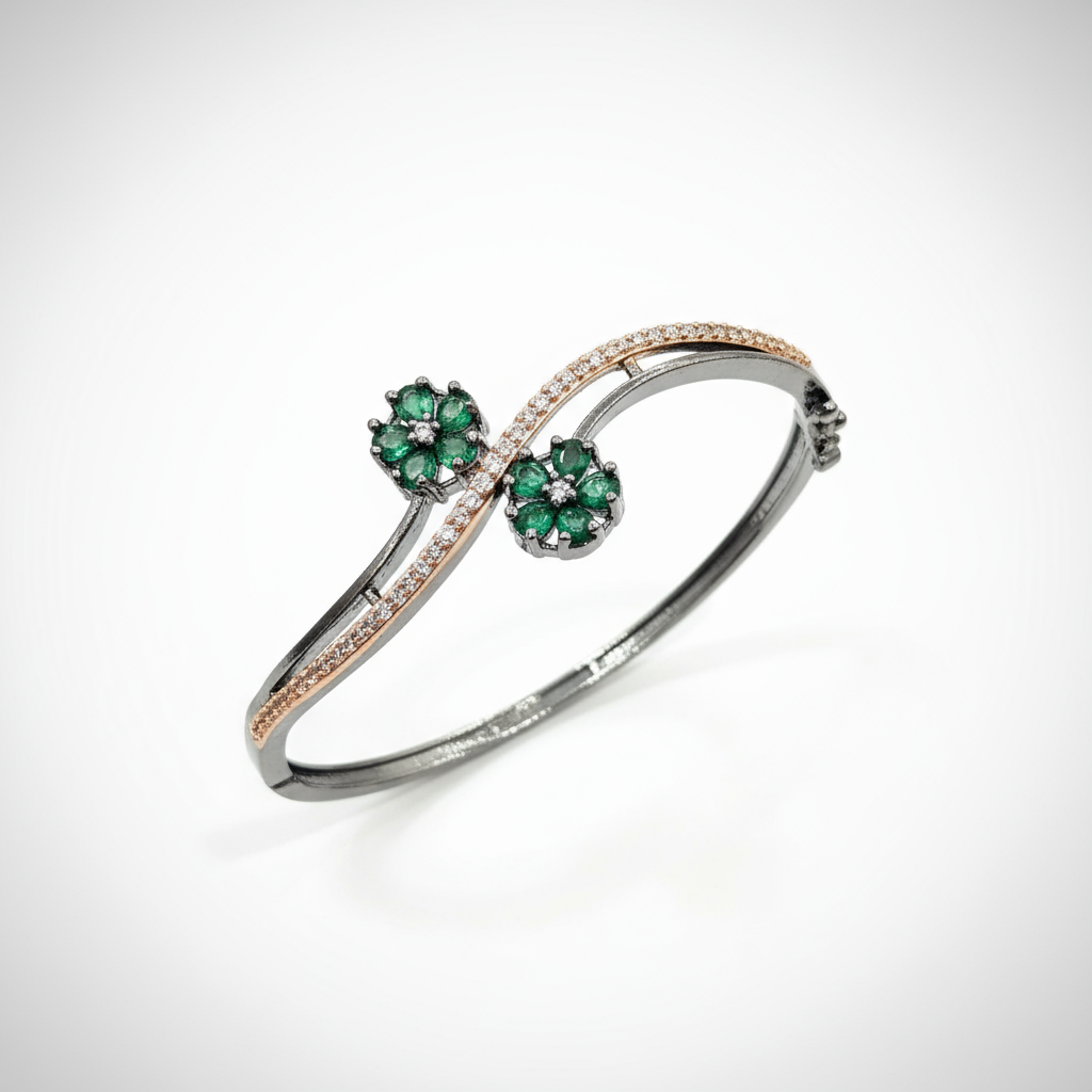 Elegant dual-flower open cuff with emerald-green petals set on a sleek charcoal base and a refined rose-gold micro pavé wave. for occasional wear, this flexible AD bracelet blends modern minimal lines with delicate floral sparkle.