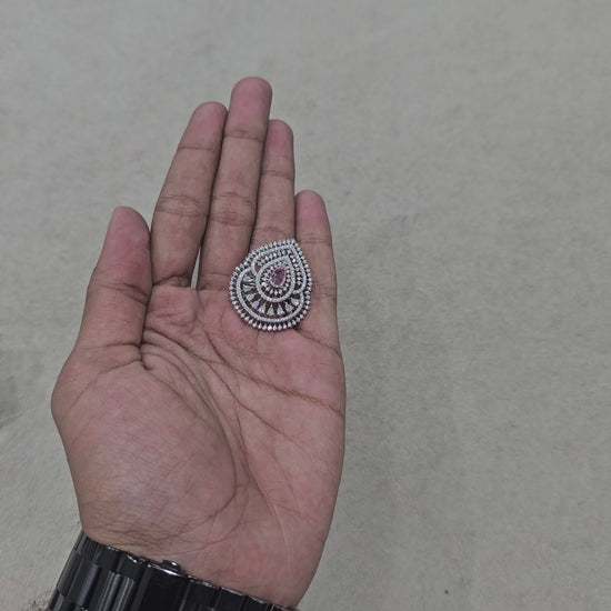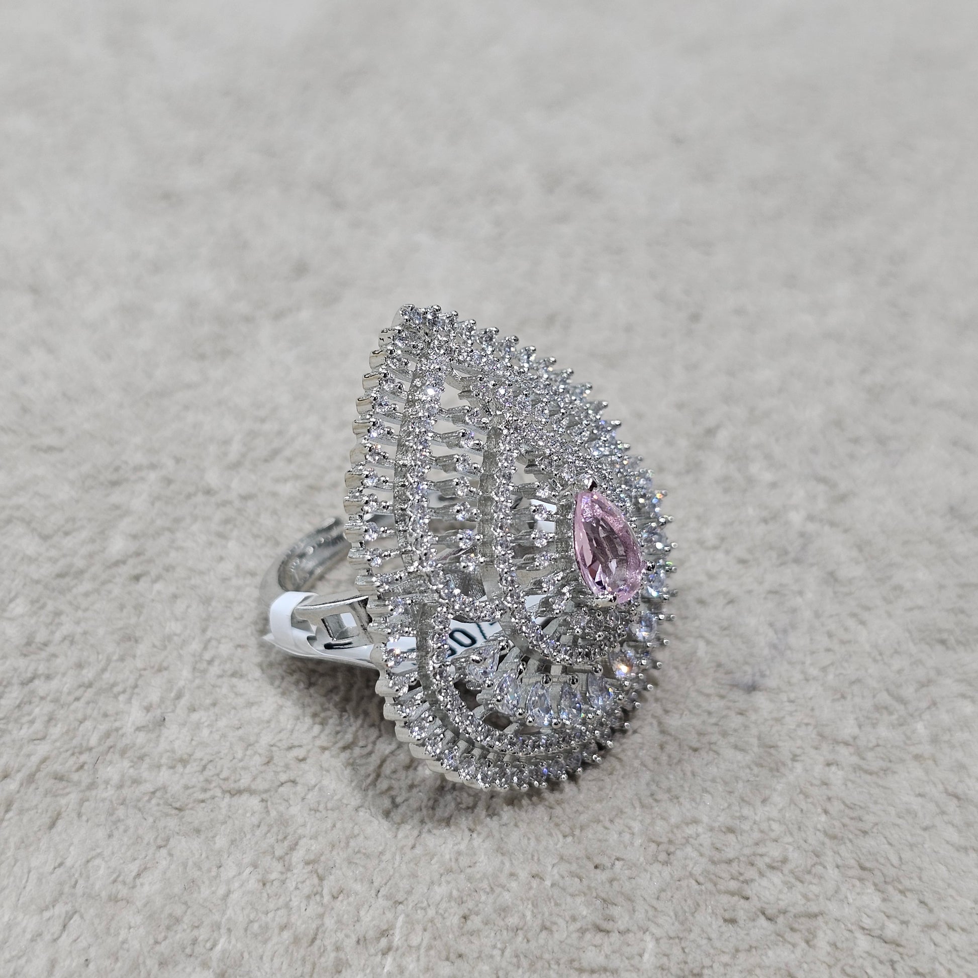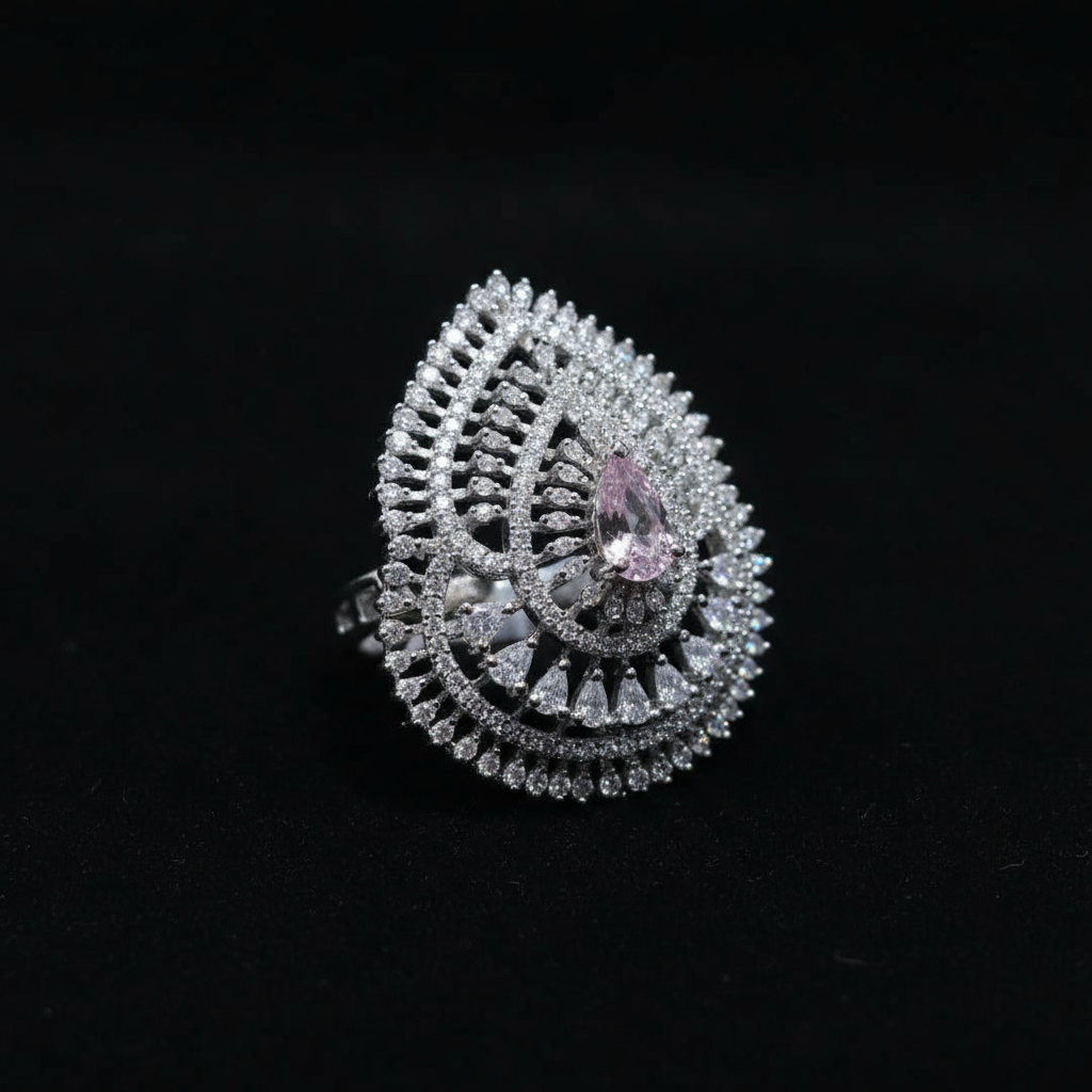 A stunning statement cocktail ring featuring a brilliant teardrop cluster design with micro-pave cubic zirconia stones. The elaborate setting is highlighted by a central pear-cut pink accent stone, perfect for adding drama and sparkle to any look.