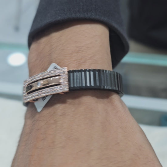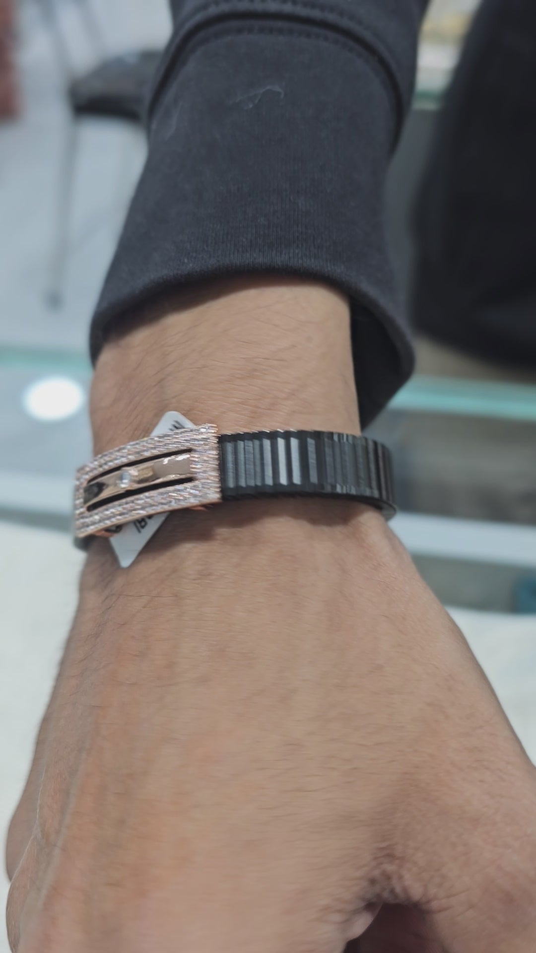 Stylish black flexible bracelet featuring a rose gold rectangular bar with sparkling diamond accents. A modern luxury bracelet designed for comfort, elegance, and everyday wear.
