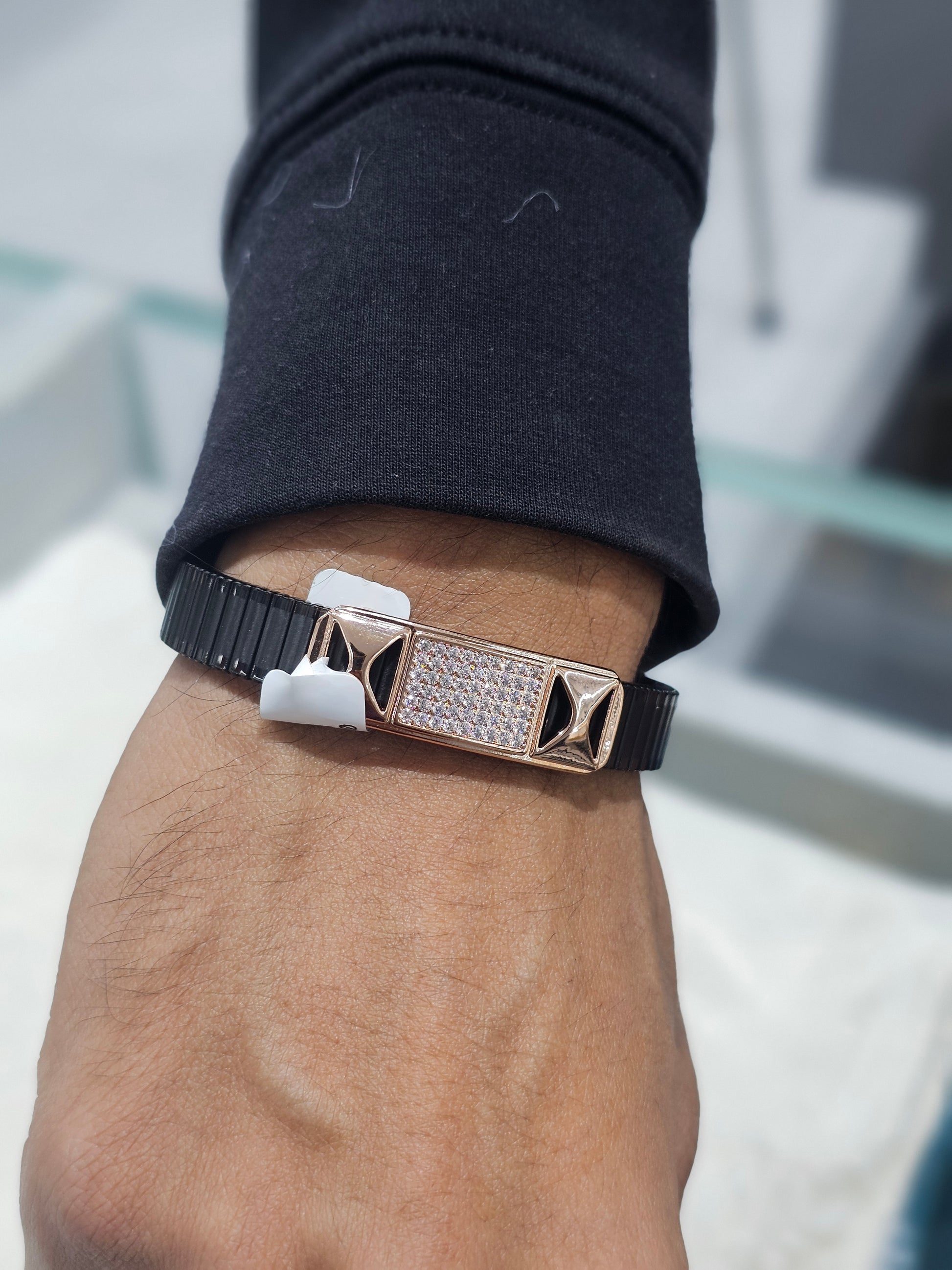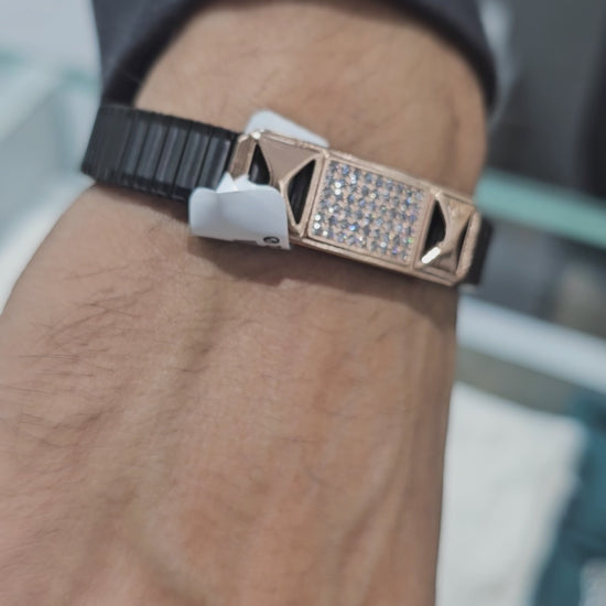Elegant black flexible bracelet featuring a rose gold rectangular panel filled with sparkling diamond accents. A modern luxury bracelet designed for comfort, style, and everyday wear.