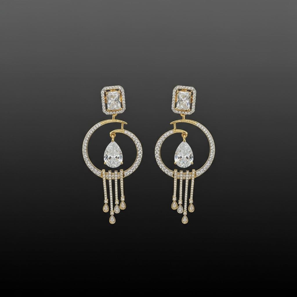 Stunning AD (American Diamond) drop earrings with a square stud and circular halo design.