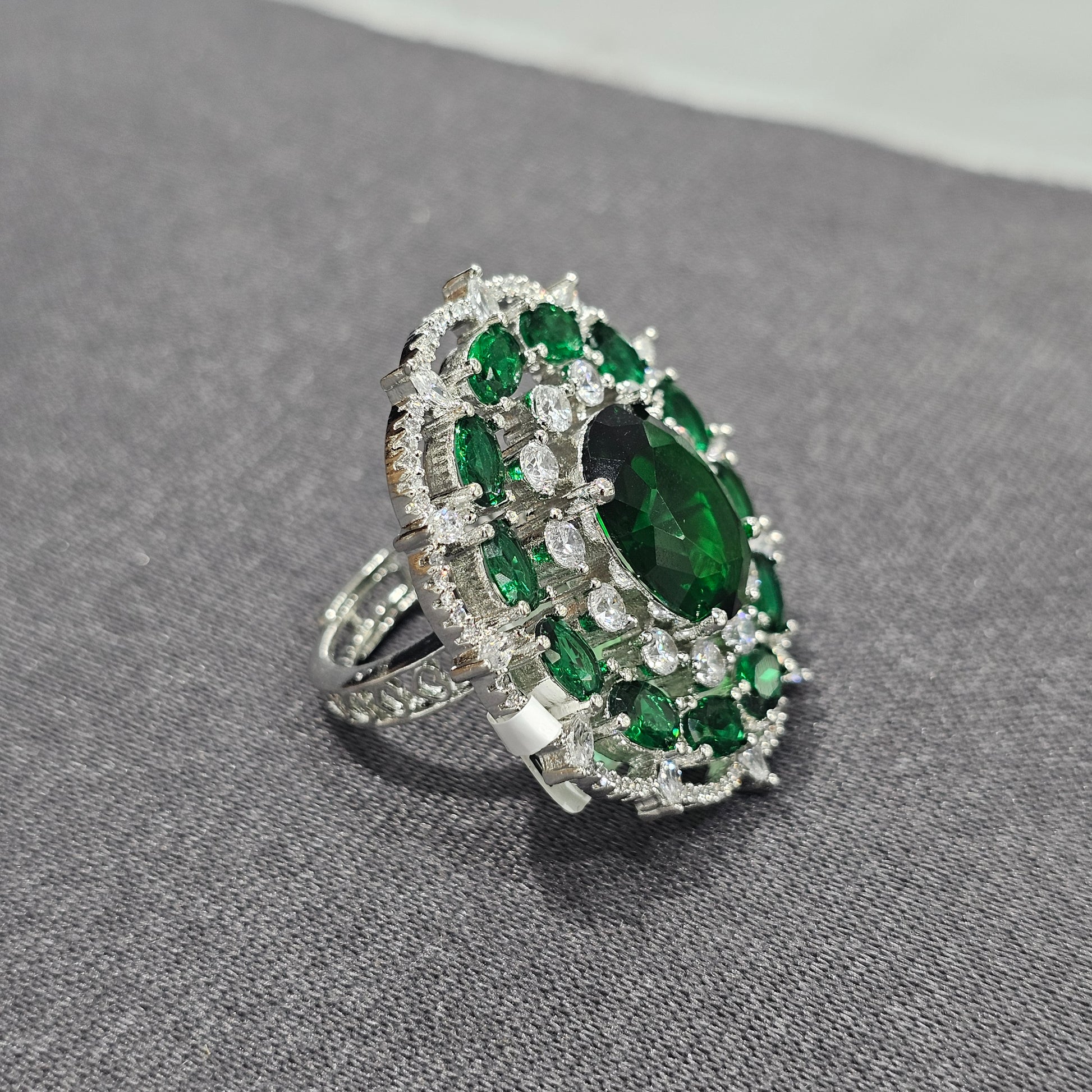 A luxurious cocktail ring with a grand cluster design reminiscent of vintage royal jewelry. It features a central oval sapphire blue stone, encircled by smaller blue oval and clear round/marquise stones in a dazzling, ornate, and silver-toned halo setting.