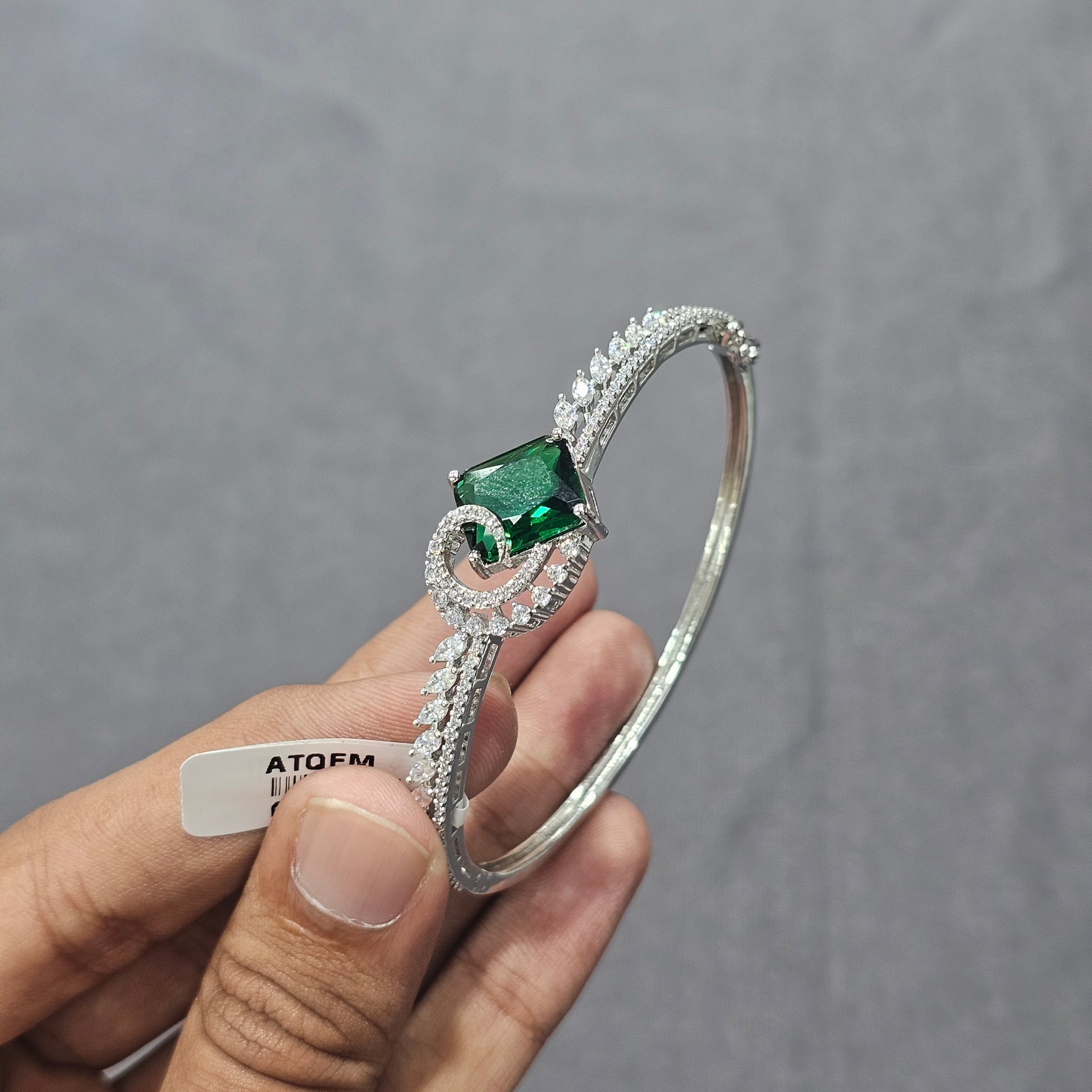 An elegant cuff featuring a baguette-cut emerald centerpiece embraced by twin swirl halos and leaf-set CZ along the band. Lightweight yet eye-catching, perfect for festive outfits and evening occasions. [1]