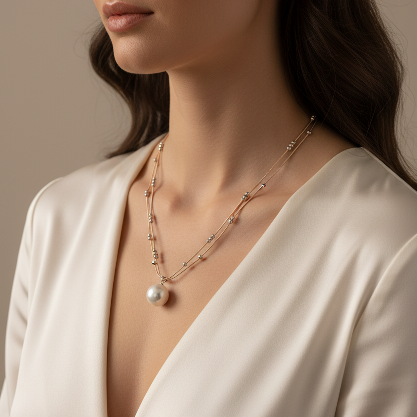 Rose Gold & Silver Plated Layered Necklace With Pearl Pendant