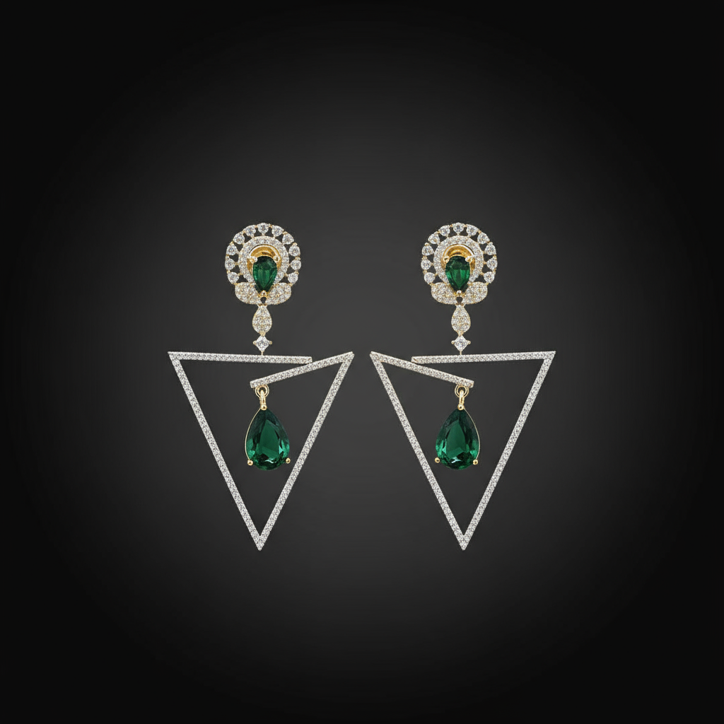 Striking AD (American Diamond) geometric drop earrings featuring a bold, crystal-studded triangle frame.