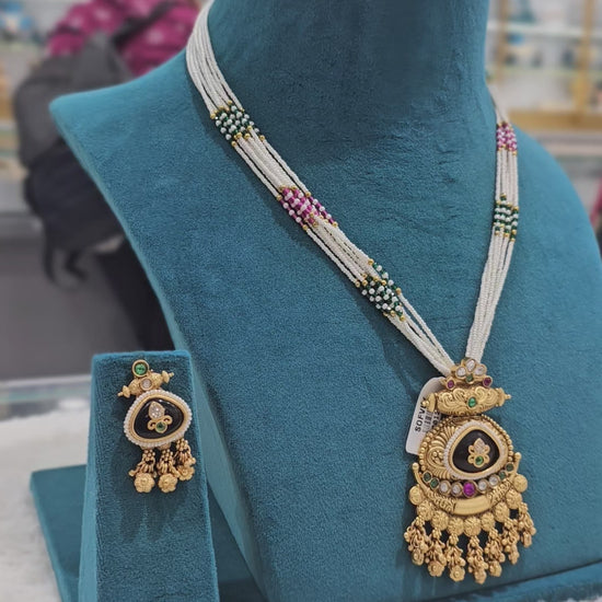 Royal Multi-Strand Pearl Temple Necklace Set with Black Enamel Pendant