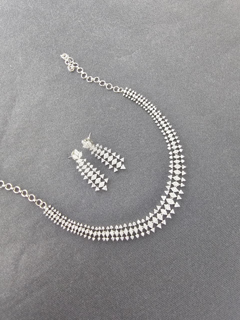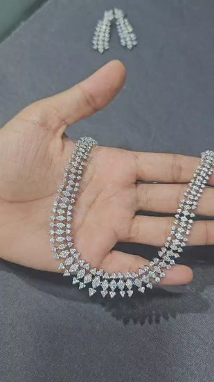 Elegant two-row necklace set with a geometric vine design, sparkling American Diamonds, and matching long drop earrings. Crafted in durable brass & alloy with a high-polish silver finish, lightweight and adjustable for weddings, parties, and festive occasions.