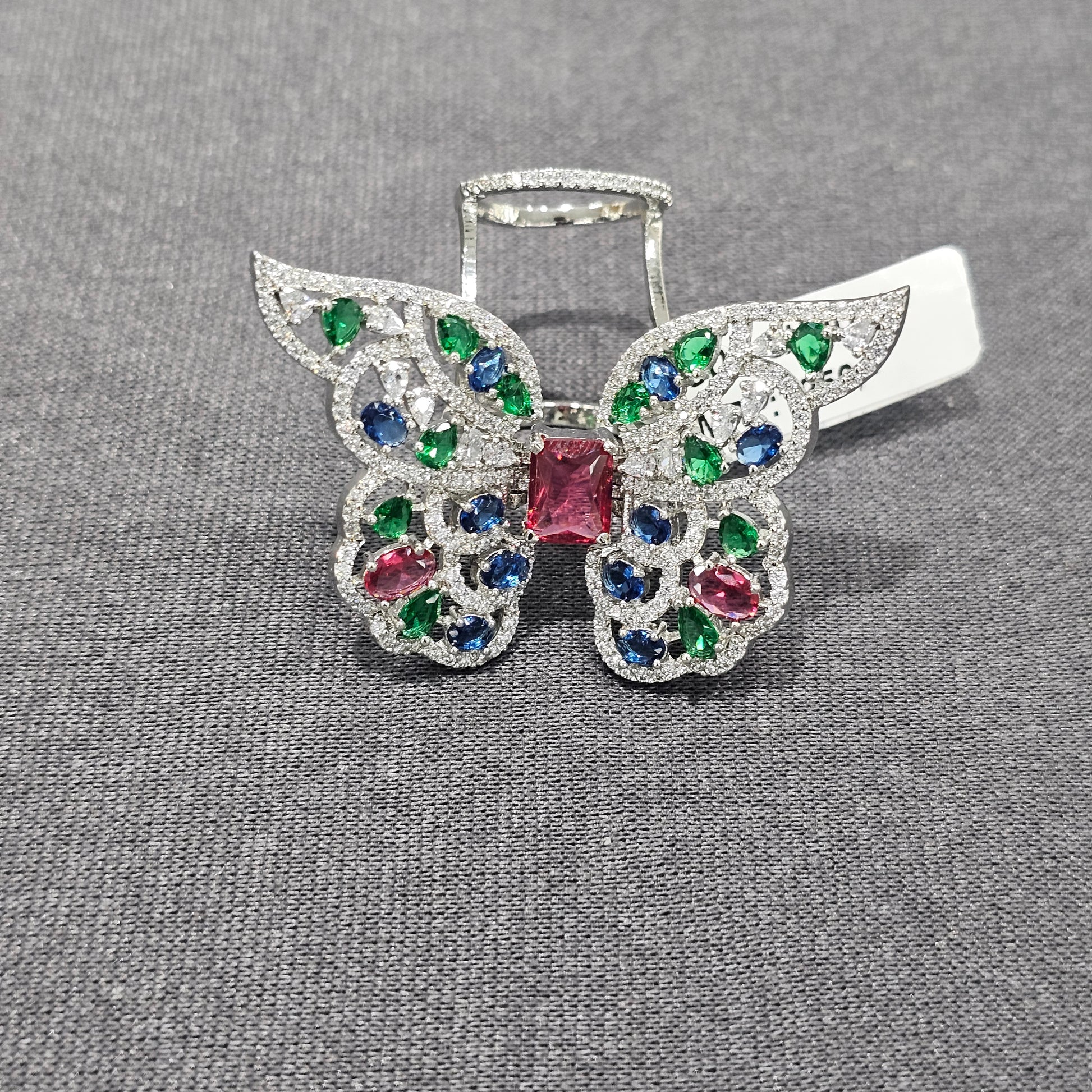 An enchanting butterfly cocktail ring featuring intricate, open-work wings fully detailed with clear cubic zirconia micro-pave. The design is brilliantly accented with multiple marquise-cut green and blue stones and a central rectangular pink stone for a vibrant, colorful look.