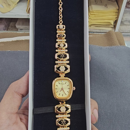Intricate motif links with crystal accents frame a petite square dial, offering a regal, occasion-ready shine in a smooth, lightweight and durable alloy build.